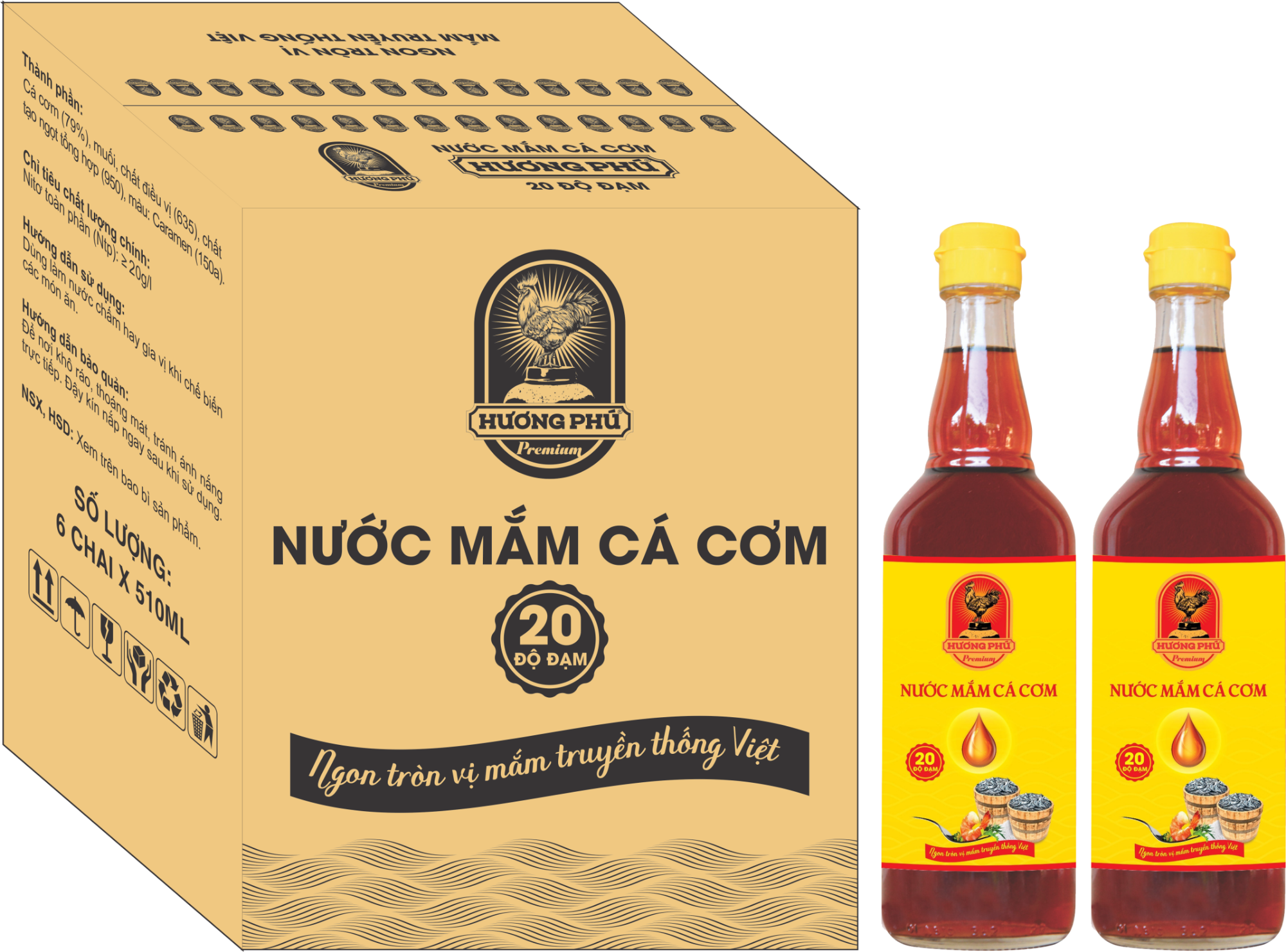 Với 100% cá cơm tươi, béo ú được chọn lựa kỹ được kết hợp với muối tinh khuyết được ủ bằng phương pháp truyền thống trong thùng gỗ được lên men tự nhiên, sau 18 đến 24 tháng những dòng nước cốt nguyên chất, không pha được rút, nhỉ ra từng giọt mắm màu cánh gián đẹp mắt, đậm đà hậu vị được đóng chai thủy tinh 510ml tạo nên Nước mắm cá cơm HƯƠNG PHÚ 20 độ đạm ngon hảo hạng.
