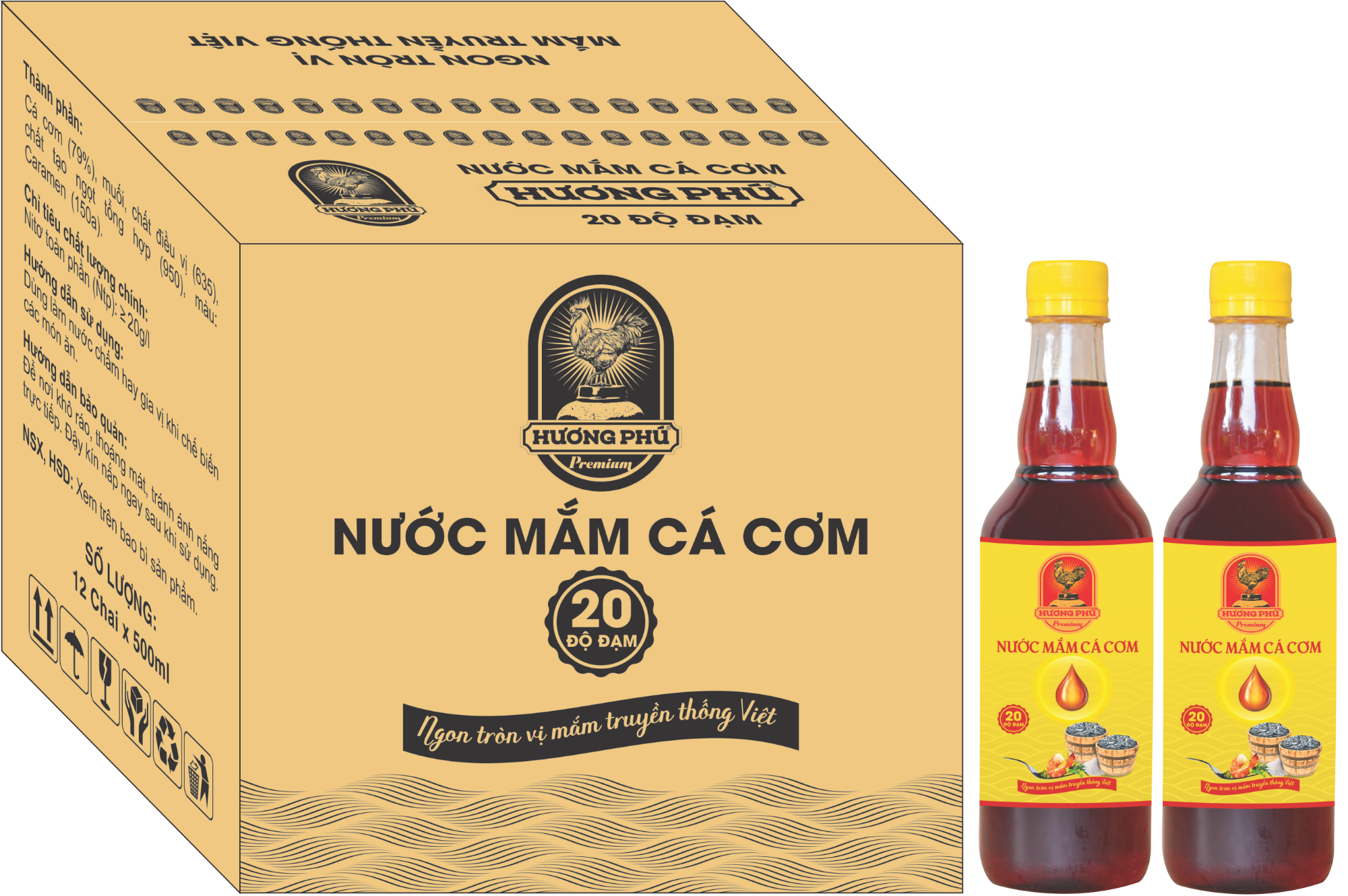 Thùng 12 chai Nước mắm cá cơm Hương Phú - 20 độ đạm - chai nhựa 500ml